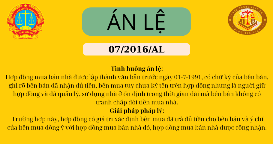 Hợp đồng mua bán nhà được lập thành văn bản trước ngày 01-7-1991, có chữ ký của bên bán, ghi rõ bên bán đã nhận đủ tiền, bên mua tuy chưa ký tên trên hợp đồng nhưng là người giữ hợp đồng và đã quản lý, sử dụng nhà ở ổn định trong thời gian dài mà bên bán không có tranh chấp đòi tiền mua nhà.
