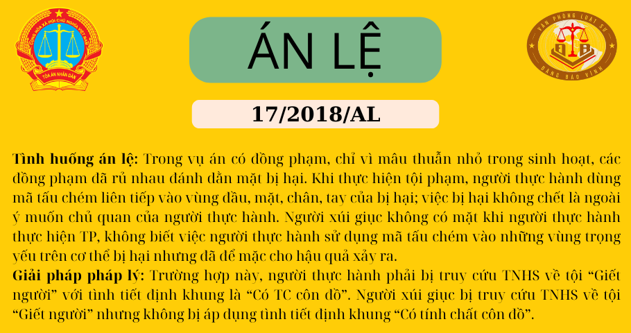 Trường hợp này, người thực hành phải bị truy cứu trách nhiệm hình sự về tội “Giết người” với tình tiết định khung là “Có tính chất côn đồ”. Người xúi giục bị truy cứu trách nhiệm hình sự về tội “Giết người” nhưng không bị áp dụng tình tiết định khung “Có tính chất côn đồ”.