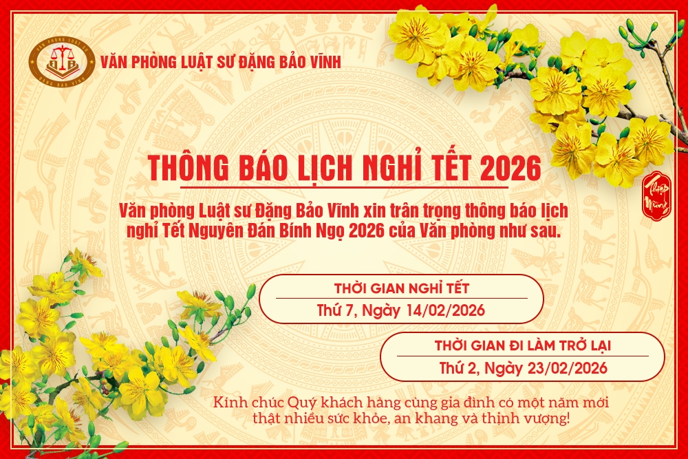 Nhân dịp nghỉ Tết Nguyên Đán 2026, Văn phòng Luật sư Đặng Bảo Vĩnh xin gửi lời chào trân trọng và lời chúc sức khỏe, hạnh phúc đến Quý khách hàng, Quý đối tác đã luôn tin tưởng, đồng hành cùng Văn phòng chúng tôi trong thời gian qua.