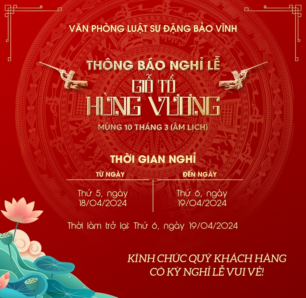 Nhằm giúp khách hàng nắm bắt được quy trình và thời gian nghỉ lễ Giỗ tổ Hùng Vương của Văn phòng cũng như tạo điều kiện thuận lợi cho việc giao dịch trong thời gian nghỉ lễ, Văn phòng Luật sư Đặng Bảo Vĩnh xin trân trọng thông báo tới Quý khách hàng, Quý đối tác lịch nghỉ lễ Giỗ tổ Hùng Vương như sau: